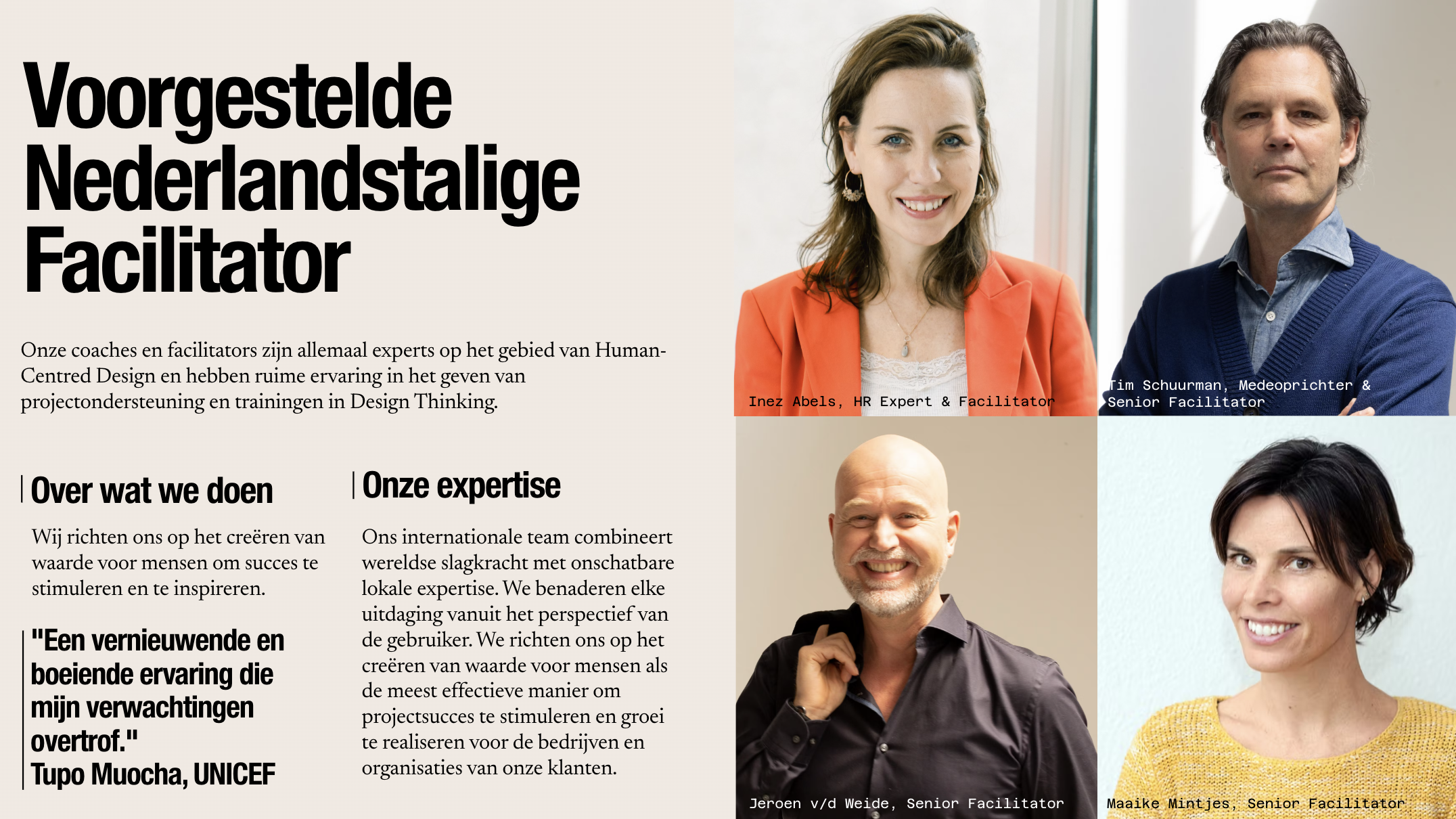 Ons team combineert internationale slagkracht met onmisbare lokale kennis en werkt voor klanten als Philips, ABN AMRO, Salesforce, Booking.com, Rainforest Alliance, ING, Bol.com, ProRail, Gemeente Amsterdam, PwC, de Belastingdienst, Heineken, KPN, Rituals en Bloomberg Philanthropies. Onze programma’s helpen deelnemers weloverwogen keuzes te maken over de juiste koers, terwijl zij praktische methoden leren beheersen om innovatie te stimuleren. Door een leeromgeving te creëren die groei ondersteunt, bouwen wij gemotiveerde, innovatiegerichte teams en leggen wij duurzame verbindingen.